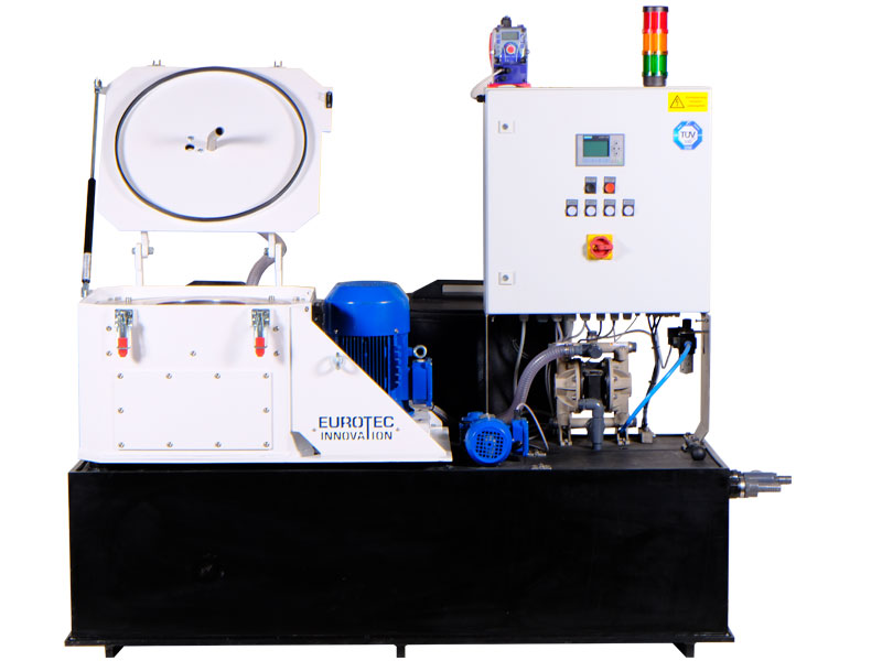 In der industriellen Fertigung gibt es zahlreiche Anwendungen, bei denen große Mengen an verunreinigten Prozessflüssigkeiten anfallen. Werden diese Flüssigkeiten aufbereitet und in einem kontinuierlichen Kreislauf geführt, so werden Kosten eingespart sowie die Umwelt und Ressourcen nachhaltig geschont. Unsere Zentrifugen mit auswechselbarem Schlammeinsatz der Baureihe ZS zeichnen sich durch deren hohe Reinigungsleistung aus. Durch das modulare Konzept bestehend aus einem Zentrifugen-Aufsatz und einem Unterbau kann die Anlage genau auf Ihre Kundenbedürfnisse angepasst werden. Zur Auswahl stehen hierbei Puffertanks mit unterschiedlichem Fassungsvolumen sowohl für Schmutz- als auch Klarwasser. ZS Zentrifugen sind besonders bedienerfreundlich, da eine SPS-Steuerung die komplette Anlage überwacht und steuert. Das Prozesswassermanagement-System überwacht hierbei selbständig Füllstände und kommuniziert mit gekoppelten Anlagen. Durch einen wechselbaren Schlammeinsatz kann der ausgetragene und getrocknete Feststoff wirtschaftlich und unkompliziert entsorgt werden.